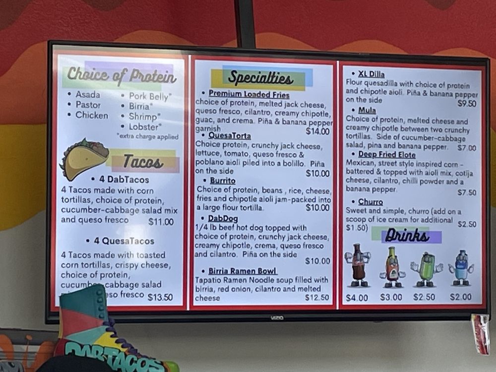 So whether you're looking for a quick bite, a place to hang out with friends, or a spot to enjoy some delicious food and drinks, Dab Tacos has you covered. Stop by and indulge in their flavorful dishes that are sure to satisfy your cravings.